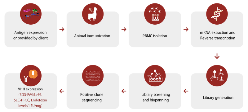 使用已構建好的naïve VHH phage library,不需要經過動物免疫,直接進入biopanning & screening 步驟,快速得到羊駝抗體。
